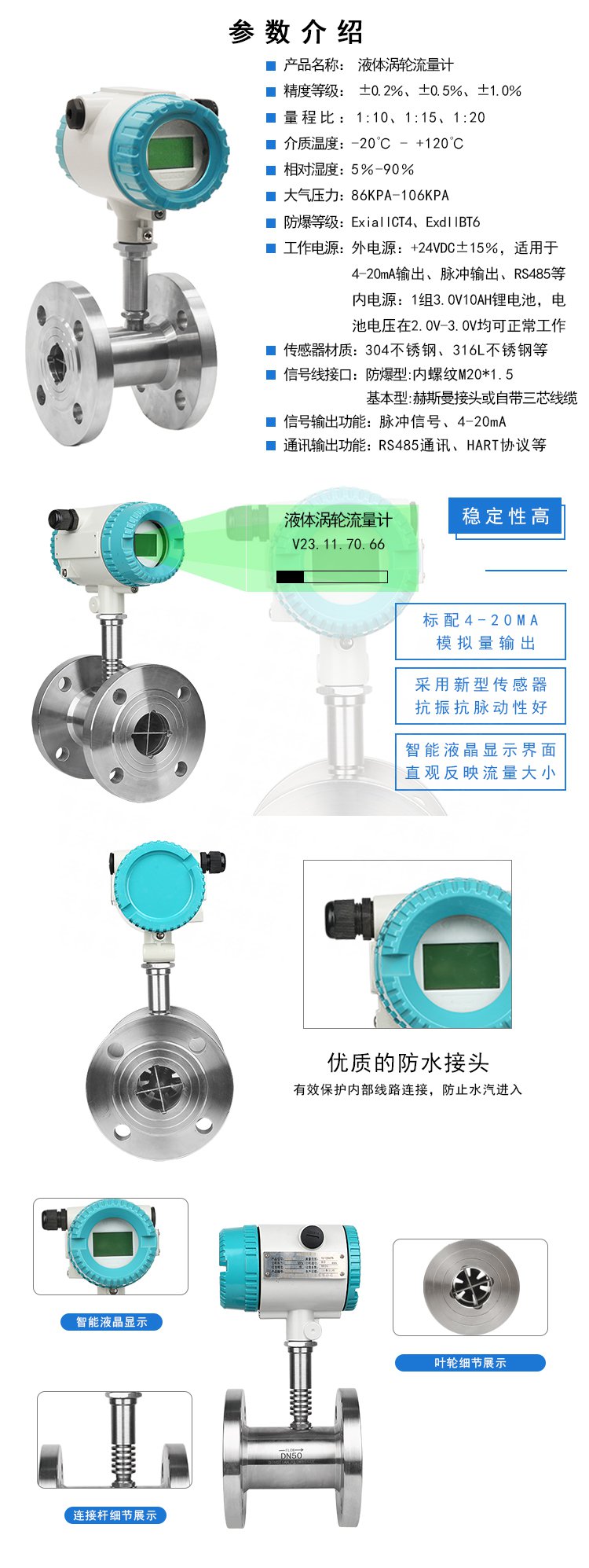 液體渦輪流量計結構為防爆設計,可以顯示流量總量,瞬時流量和流量滿度百分比。